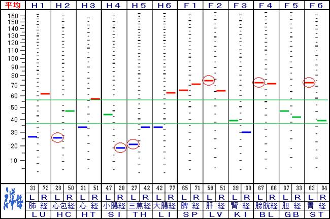良導絡測定は、手足24ケ所の代表測定点の皮膚通電抵抗を測定することにより、交感神経系の興奮性を知ることができます。自律神経の状態を数値化して見ることができるので、普通ではわかりづらい鍼灸治療の診断方法と違って、一定のルールに従って測定すれば、誰がいつ行っても同じ条件で測定時点の状態を測定できます。